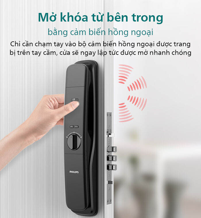 | Mở khóa từ bên trong | – Cảm biến hồng ngoại – chạm tay nắm để mở tự động – Nút bấm hoặc núm xoay – Chốt an toàn bên trong |